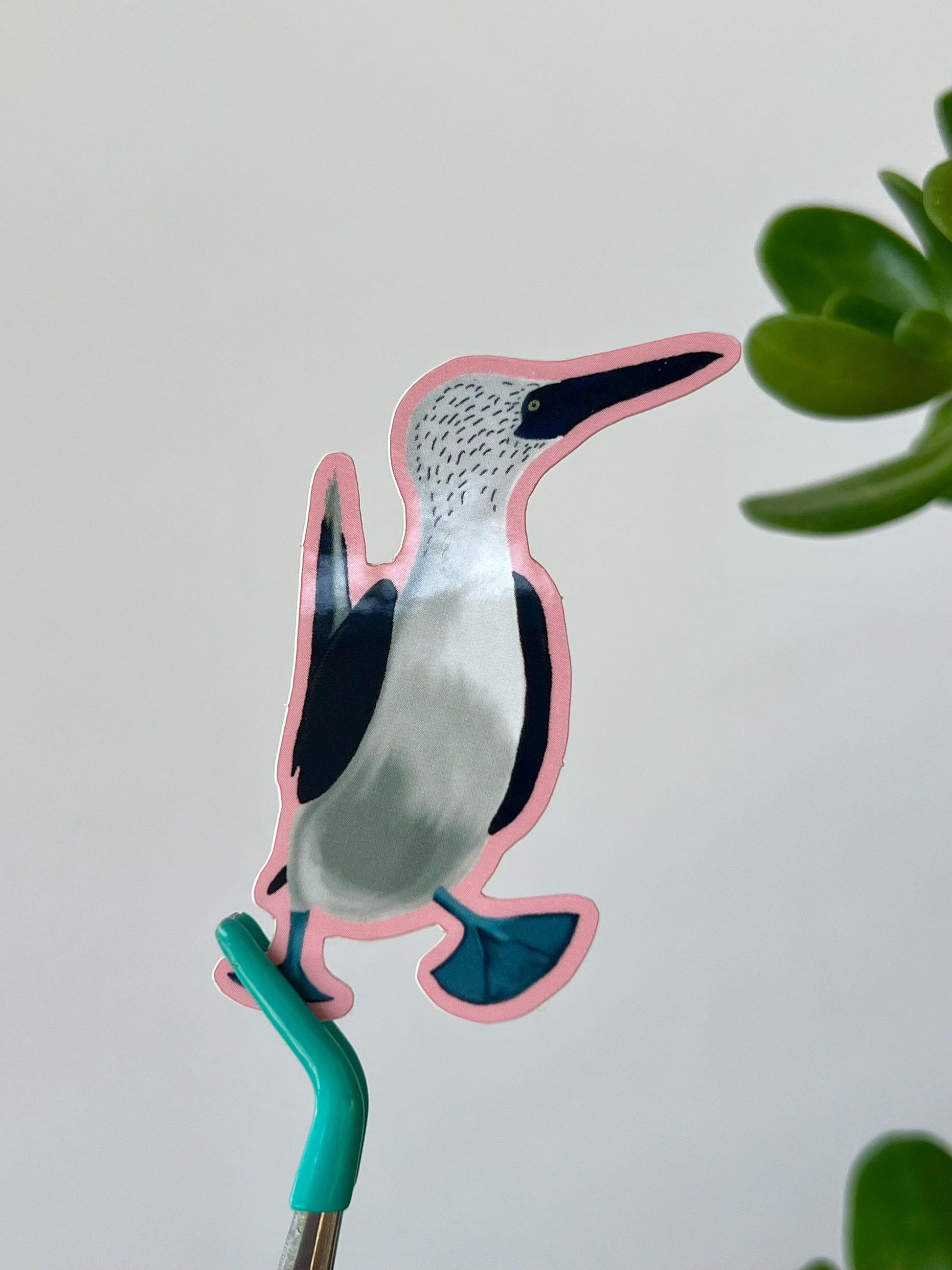 This sweet little Blue-footed Booby bird sticker is ready to brighten up your day with their flashy feet and pop of pink background. This professionally printed vinyl sticker measures 1.5 inches by 2.5 inches.