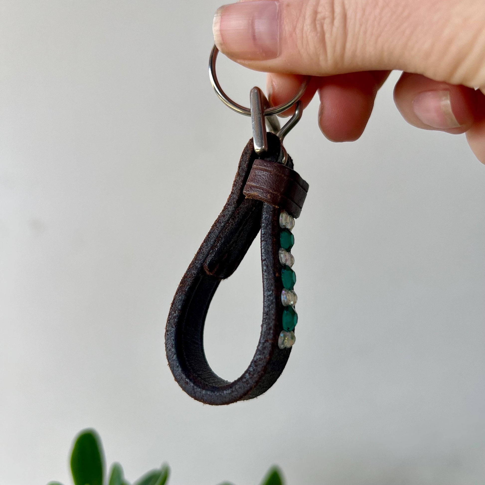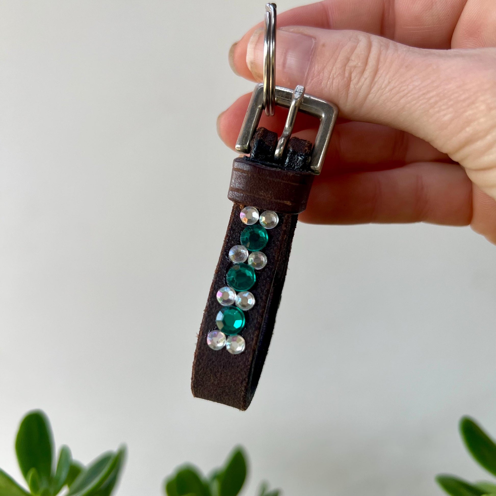 This handcrafted keychain is made from reclaimed bridle leather and adorned with white and teal rhinestones. It would make a perfect gift for any equestrian or horse lover! Cowboys and cowgirls alike can appreciate this one-of-a-kind rhinestone and leather keyring.