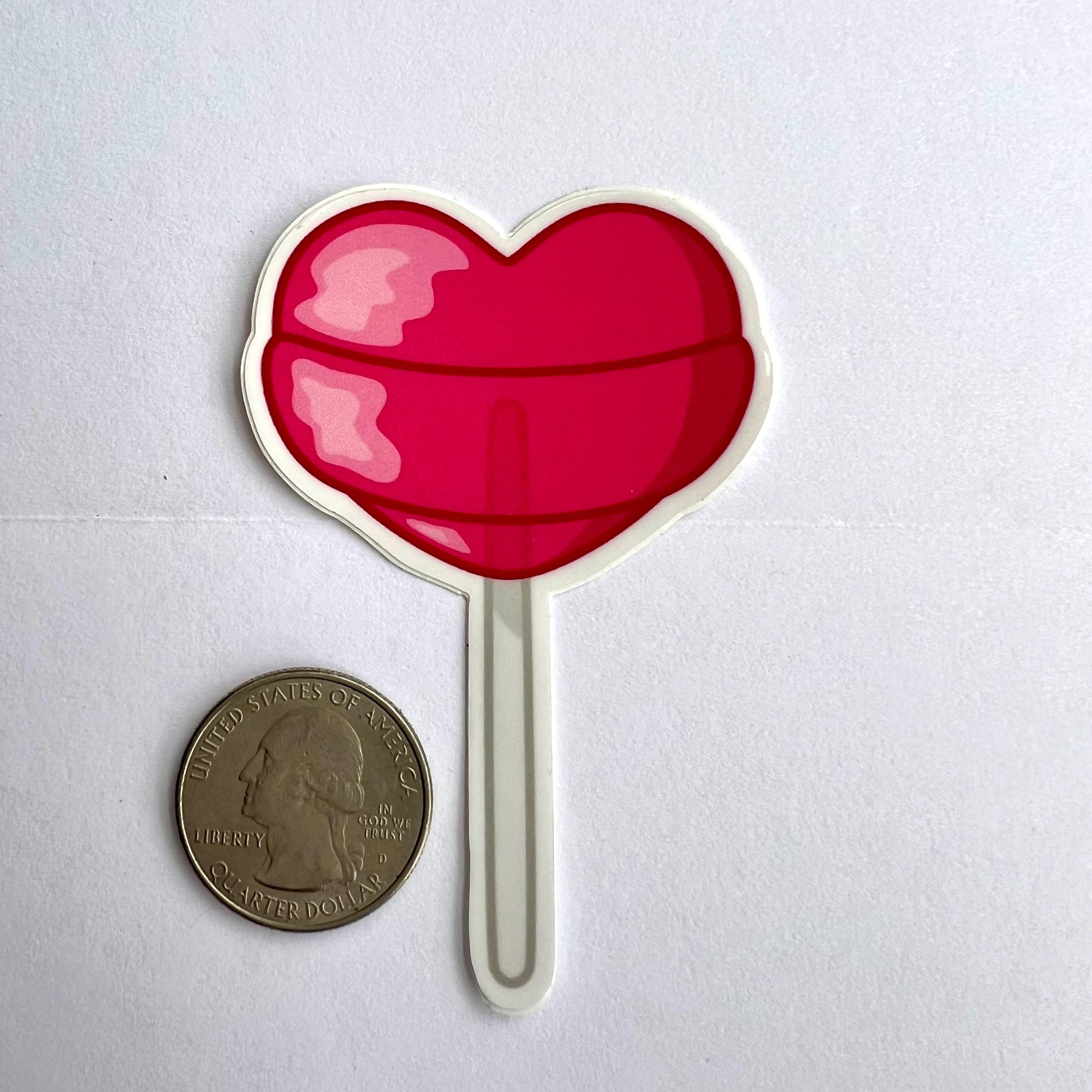 This bright pink heart lollipop sticker measures 2 inches by 3 inches.